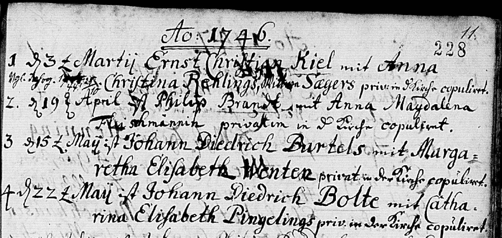 | Heirat eines Kinds | Johann Engelbert Kiel — Juliane Friederike Dunker — Diese Familie ansehen 29. November 1789 (Alter 71 Jahre) Quelle: Brand, Heinrich |
