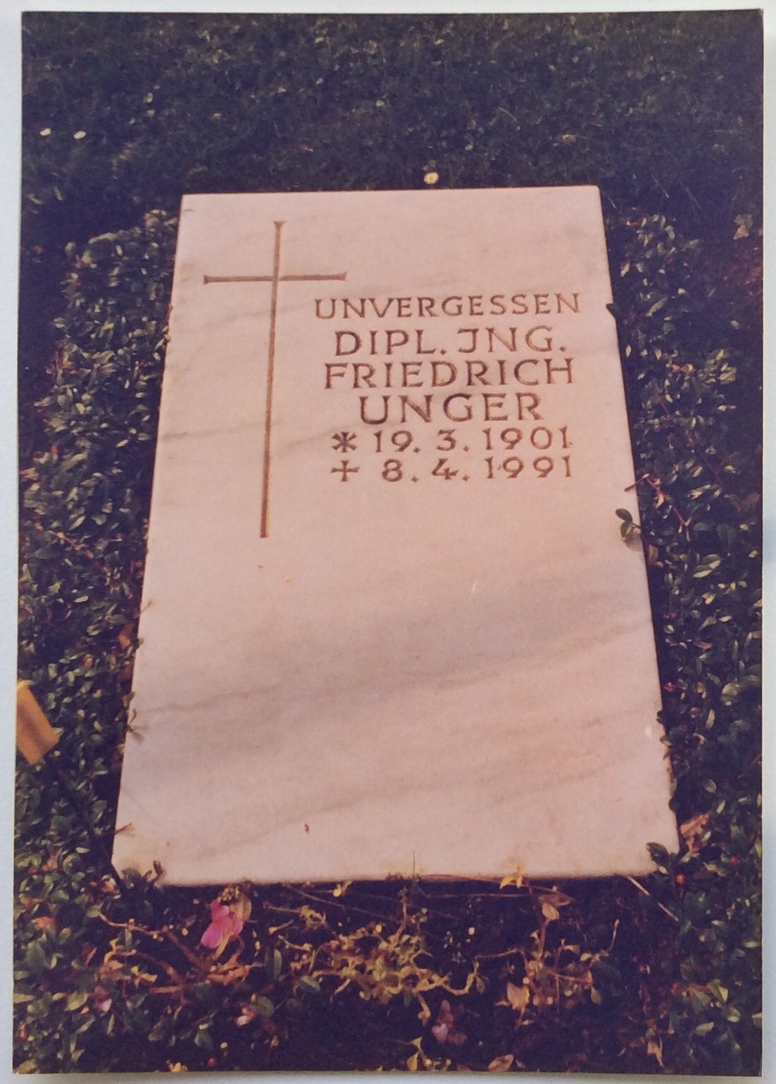 Friedrich Josef Vinzenz „Fritz“ Unger, Abteilungsleiter, Diplomingenieur (am 18. Januar 1936), Regierungsbaurat (im Jahr 1960) und Architekt, Sohn von Vinzenz Unger und Maria Theresia Cusolle, wurde geboren am 19. März 1901 in Podmokly - Bodenbach, Děčín - Tetschen, Ústecký - Aussig, Czech Republic und starb am 8. April 1991 in Rotthalmünster, Passau, Bayern, Germany im Alter von 90 Jahren. Er heiratete Ellen Wilma Honigmann, Tochter von Ernst Gotthelf Honigmann und Adolphina Dorothea Victoria „Ada“ Noots.